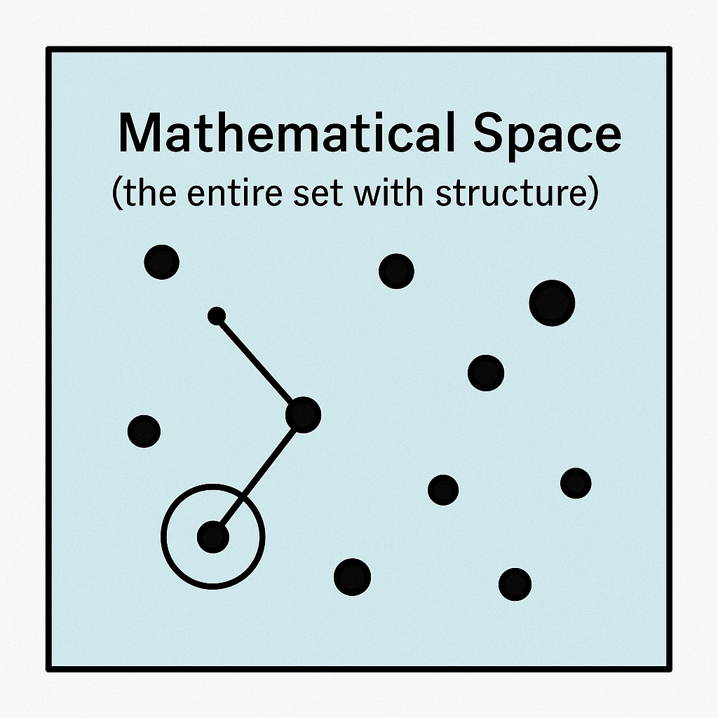 これと同様に、数学における空間も、まず要素の集合があり、そこに距離や近傍といった規則を与えることで、要素どうしの関係(近い・つながる・連続に変化するなど)を扱えるようになる。4ただし数学で扱う要素は物質的な粒子ではなく、あくまで抽象的な要素によって構成される。